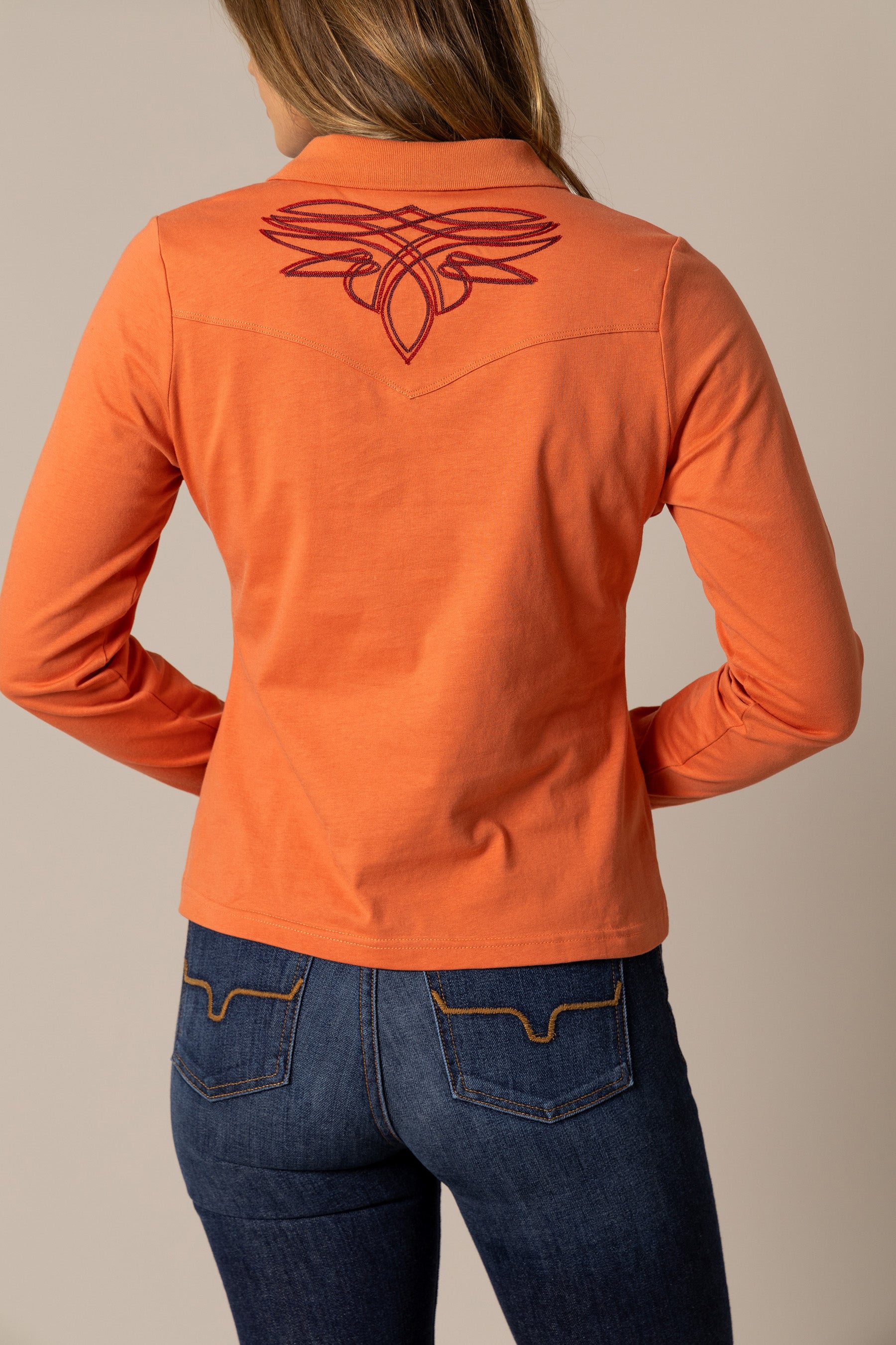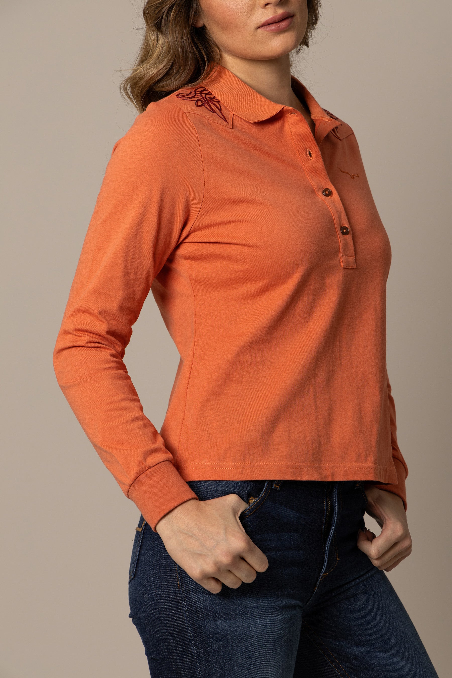 Bluebell Embroidered Polo delivers a sophisticated twist on a classic long-sleeve polo. Designed with a sharp collar and button placket neckline. it’s finished with elegant western-inspired embroidery across the yoke for subtle detail that sets it apart. The structured design provides a polished silhouette while remaining easy to wear. making it versatile enough for work. weekends. or evenings out. Pair it with denim for a casual yet refined look. or layer it under a blazer for a touch of Western-inspired elegance in a more formal setting. Bluebell is the perfect blend of timeless style and modern Western influence.