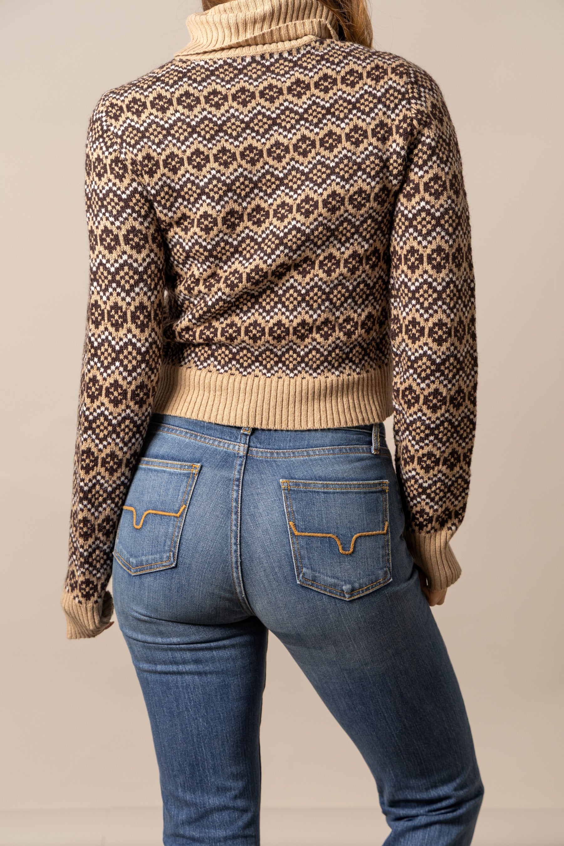 The Hazel Turtleneck delivers cozy warmth and western-inspired style in one eye-catching piece. Crafted from a fine merino wool blend. this soft and breathable sweater features a distinctive pattern that makes it a true statement piece. The ribbed turtleneck. cuffs. and hem provide a polished finish. while the thicker knit keeps you snug through the coldest winter days. Designed with a fitted. cropped silhouette. the Hazel pairs effortlessly with high-rise jeans or tailored layers.
