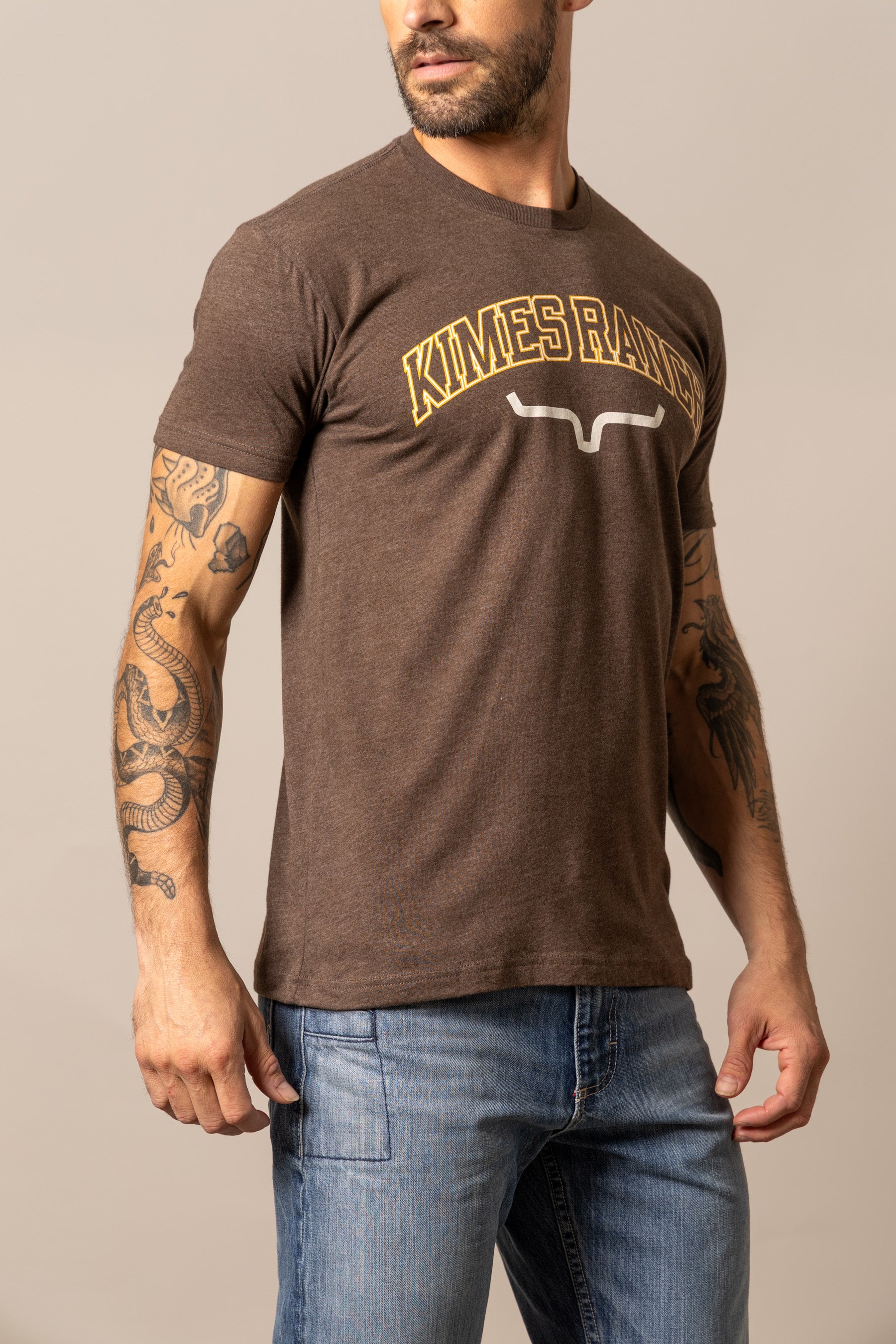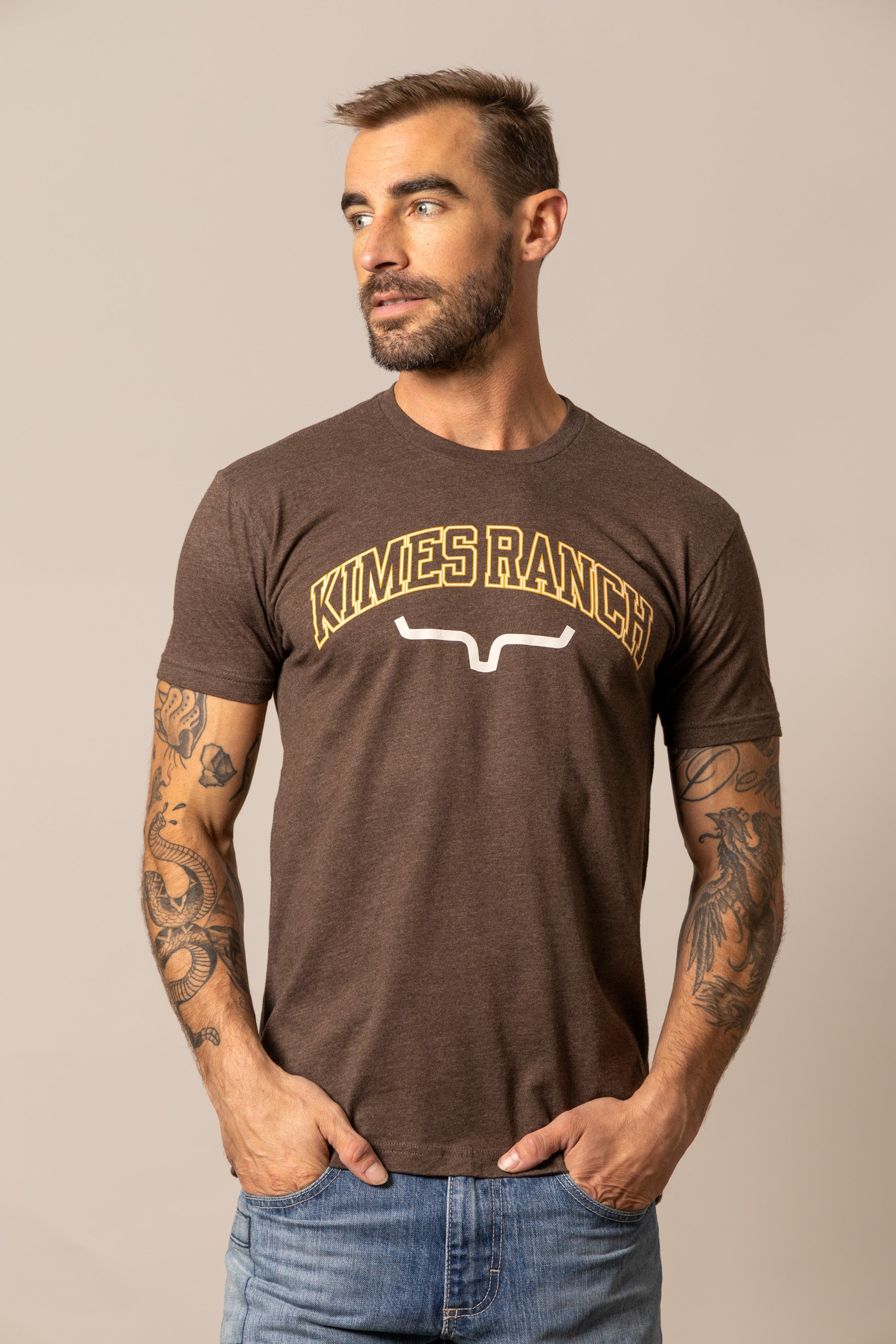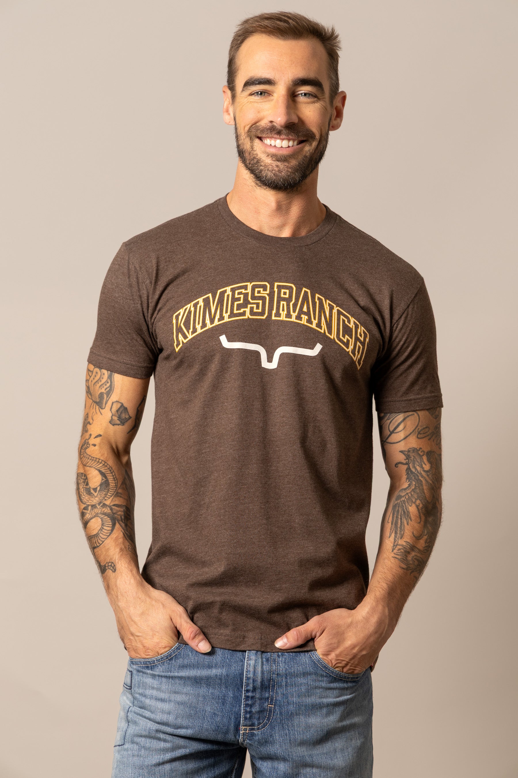 The KR University Tee combines classic varsity style with western roots. Featuring bold Kimes Ranch lettering across the chest and the signature logo beneath. this shirt keeps it clean. confident. and timeless. Made from a soft cotton-poly blend. it offers durability and comfort in a men’s regular fit. With its soft-hand print. it’s a versatile staple for anyone who takes pride in representing the brand and the western lifestyle.