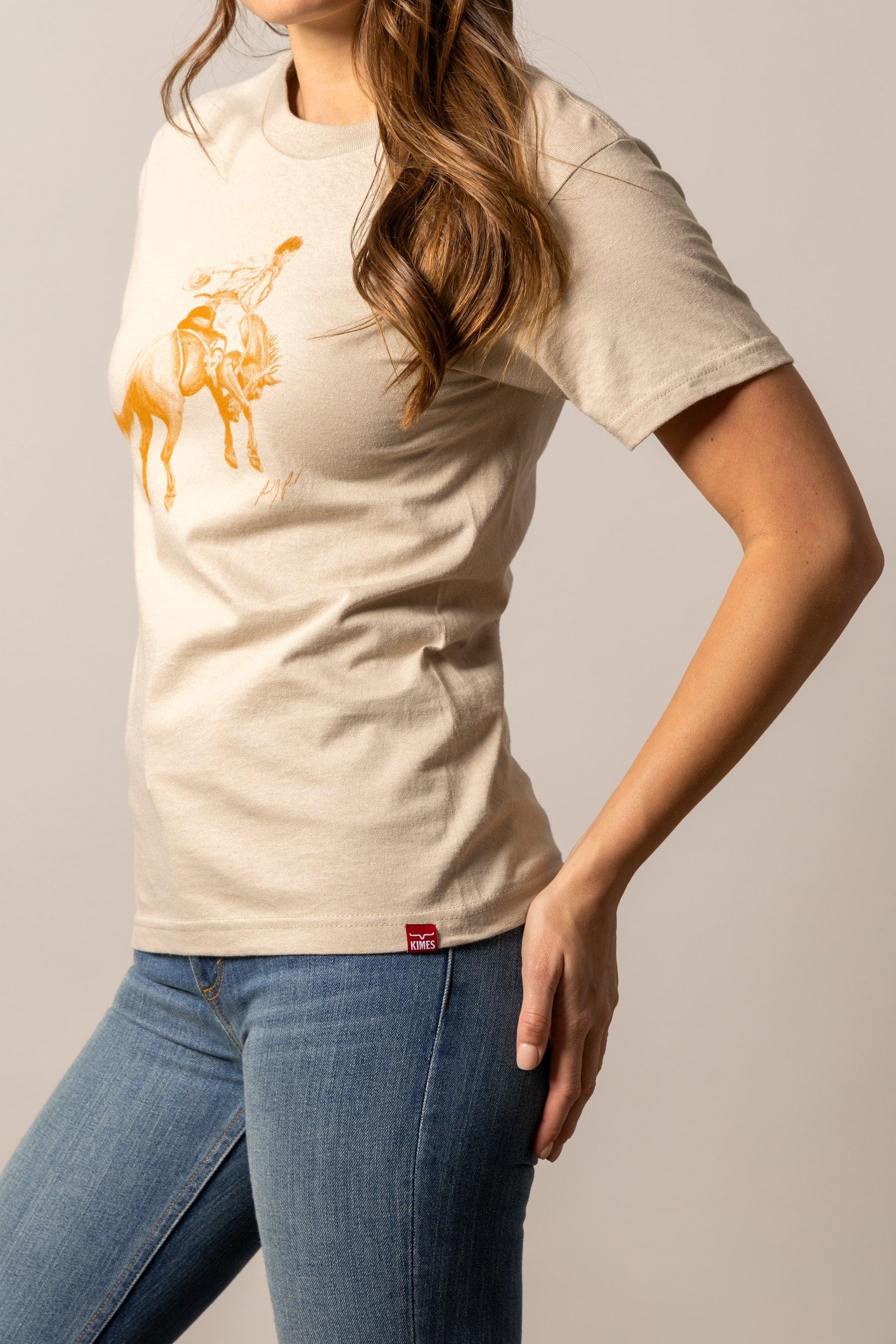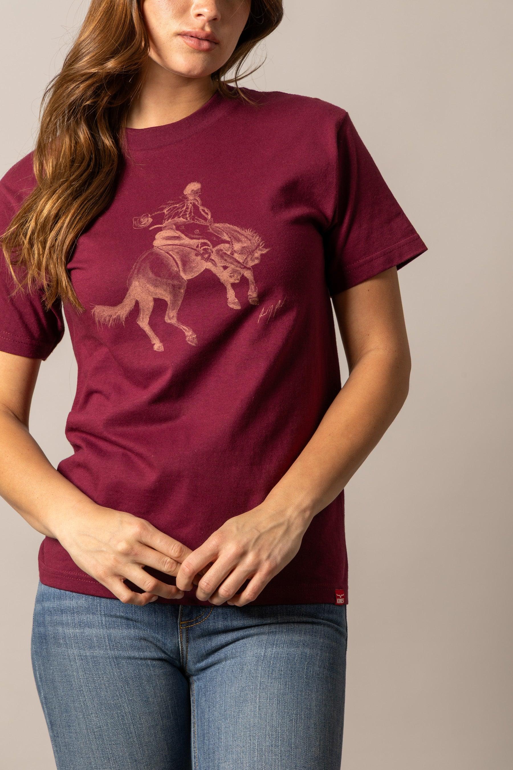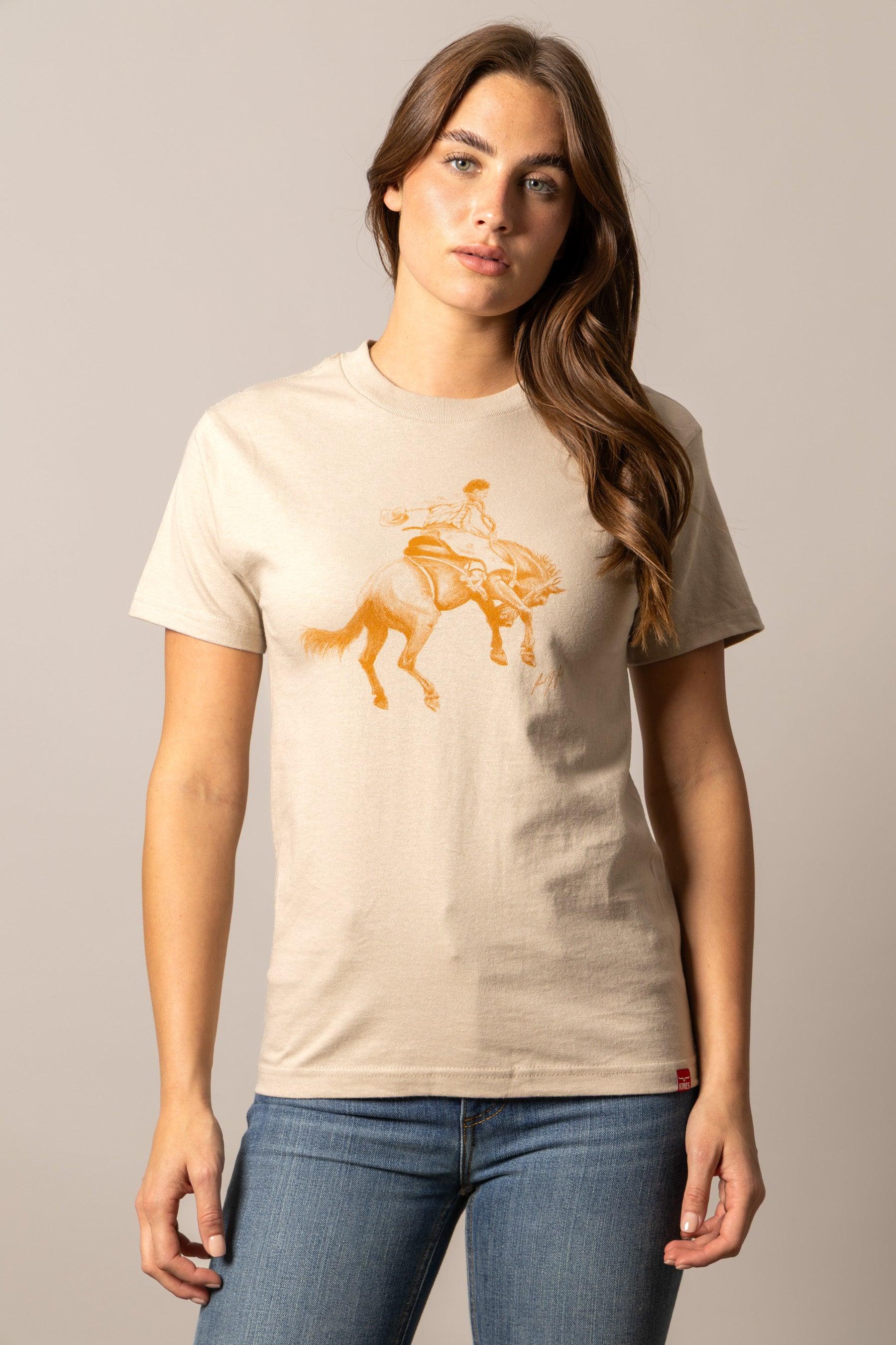 True Western art meets everyday wear. Featuring an exclusive bucking bronc graphic by renowned artist Randy Paul. this tee captures the raw power and spirit of the American West. Soft. flattering. and built for life in and out of the arena. it’s a wearable piece of art that speaks to the grit of the western way of life.