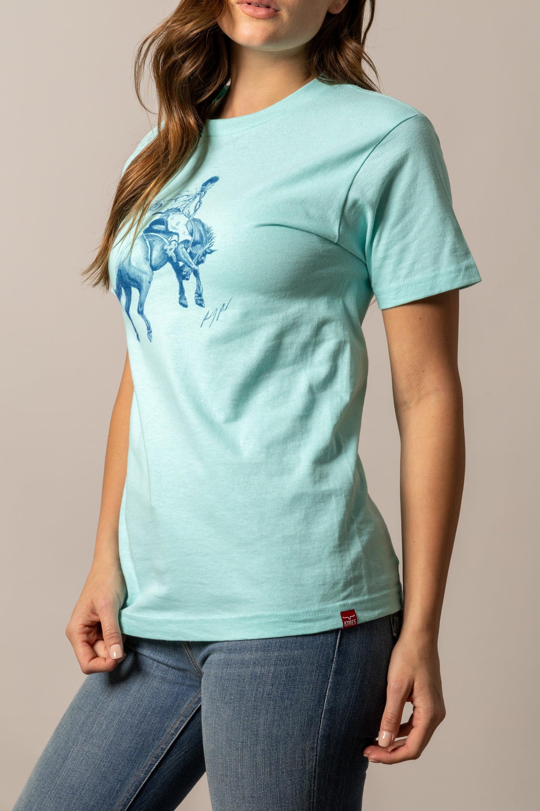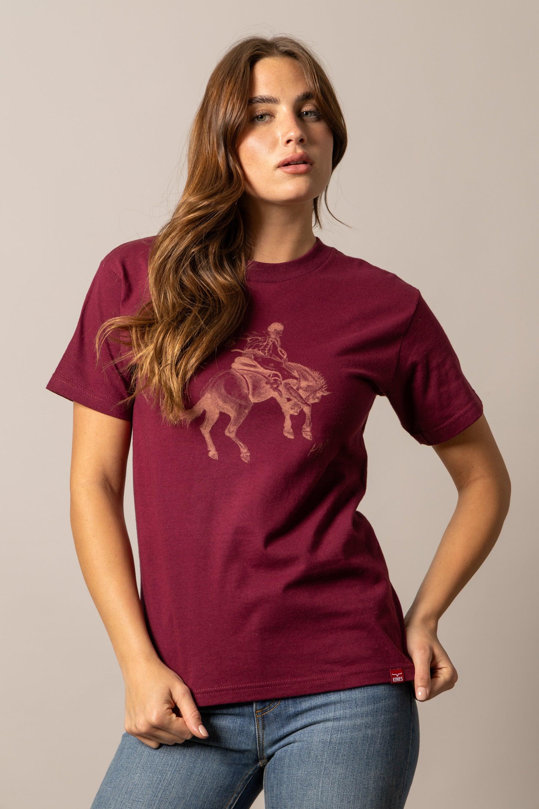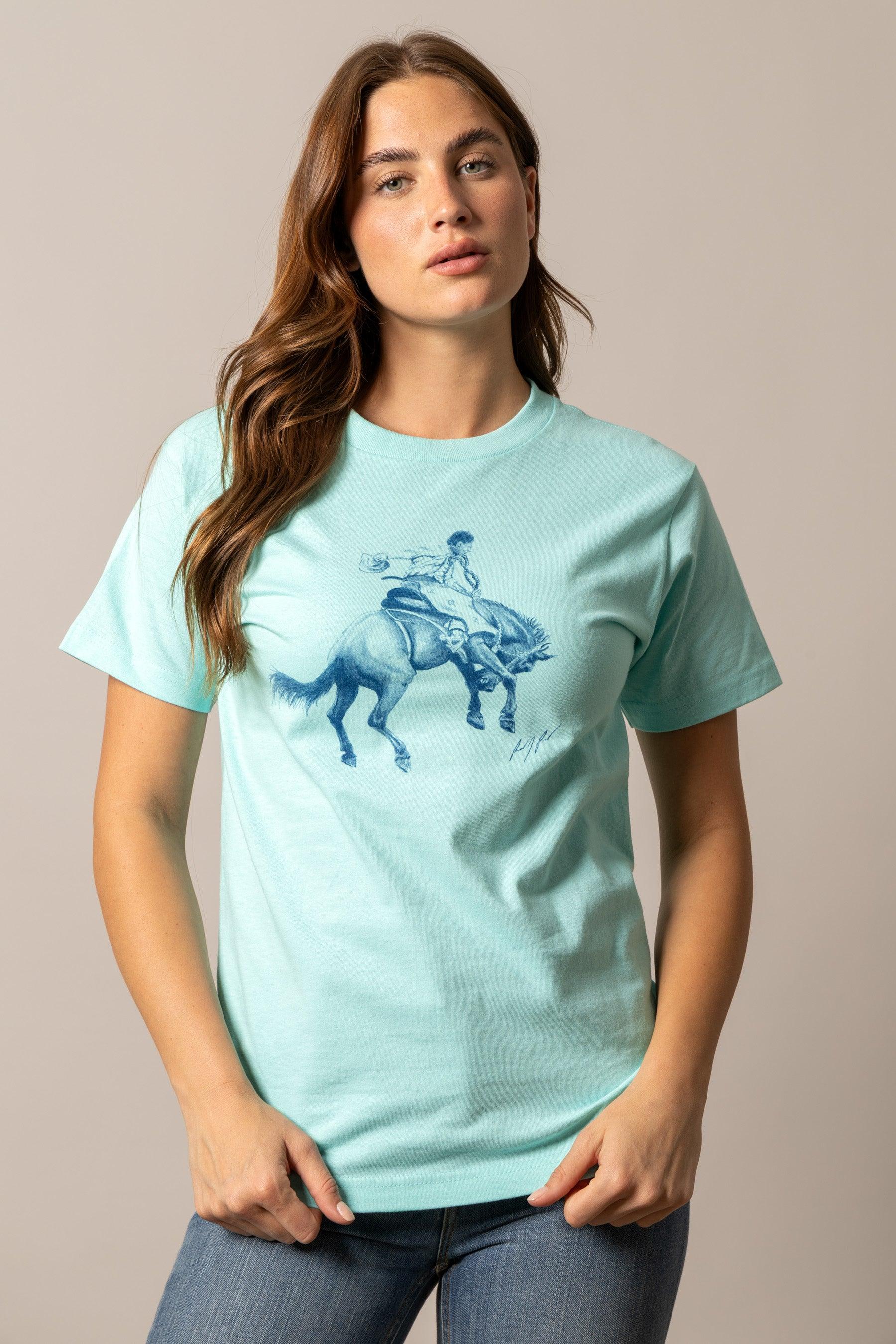 True Western art meets everyday wear. Featuring an exclusive bucking bronc graphic by renowned artist Randy Paul. this tee captures the raw power and spirit of the American West. Soft. flattering. and built for life in and out of the arena. it’s a wearable piece of art that speaks to the grit of the western way of life.