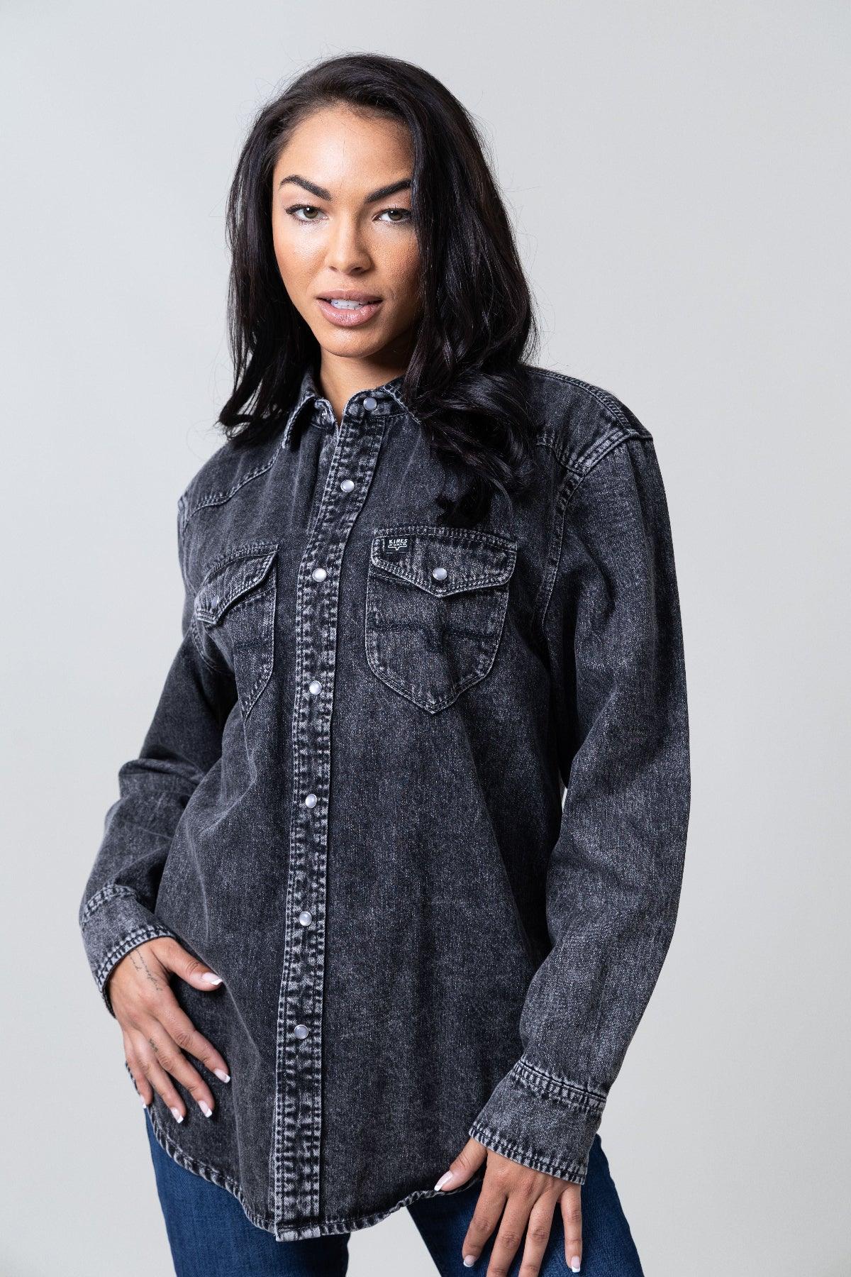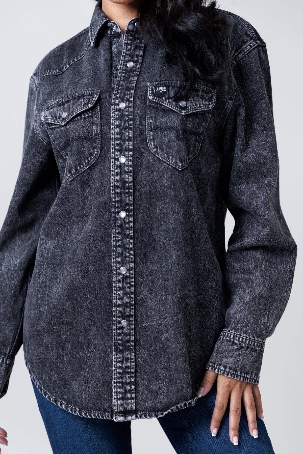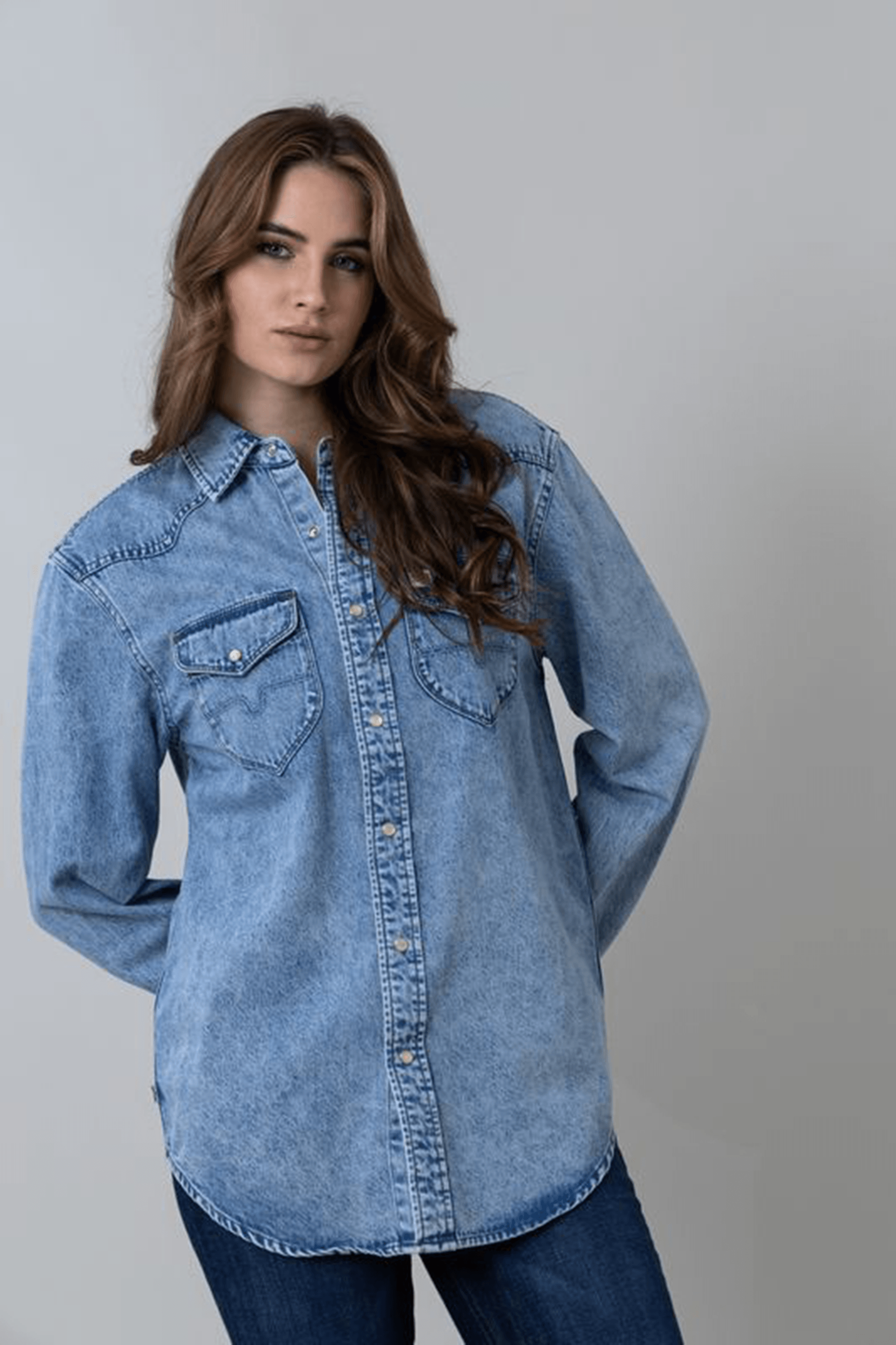 Meet the Sandoval. your ideal oversized boyfriend button-down denim shirt. Sandoval exudes a lived-in feel. offering the perfect blend of comfort and style. Adorned with two front pockets and pearl snaps. it’s the ultimate addition to your wardrobe. Feel the soft. lived-in comfort and vintage charm of Sandoval. perfectly marrying practicality and style.