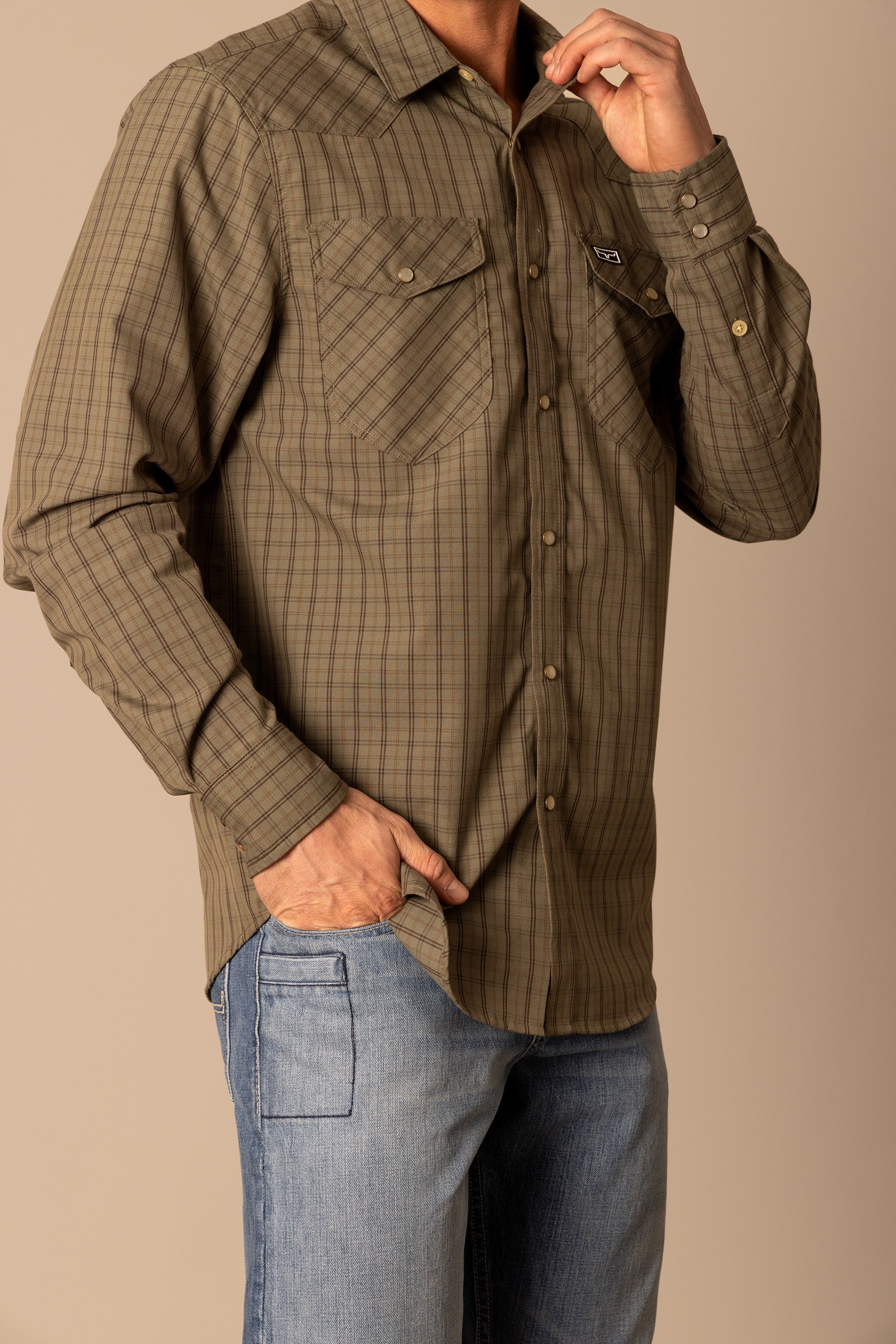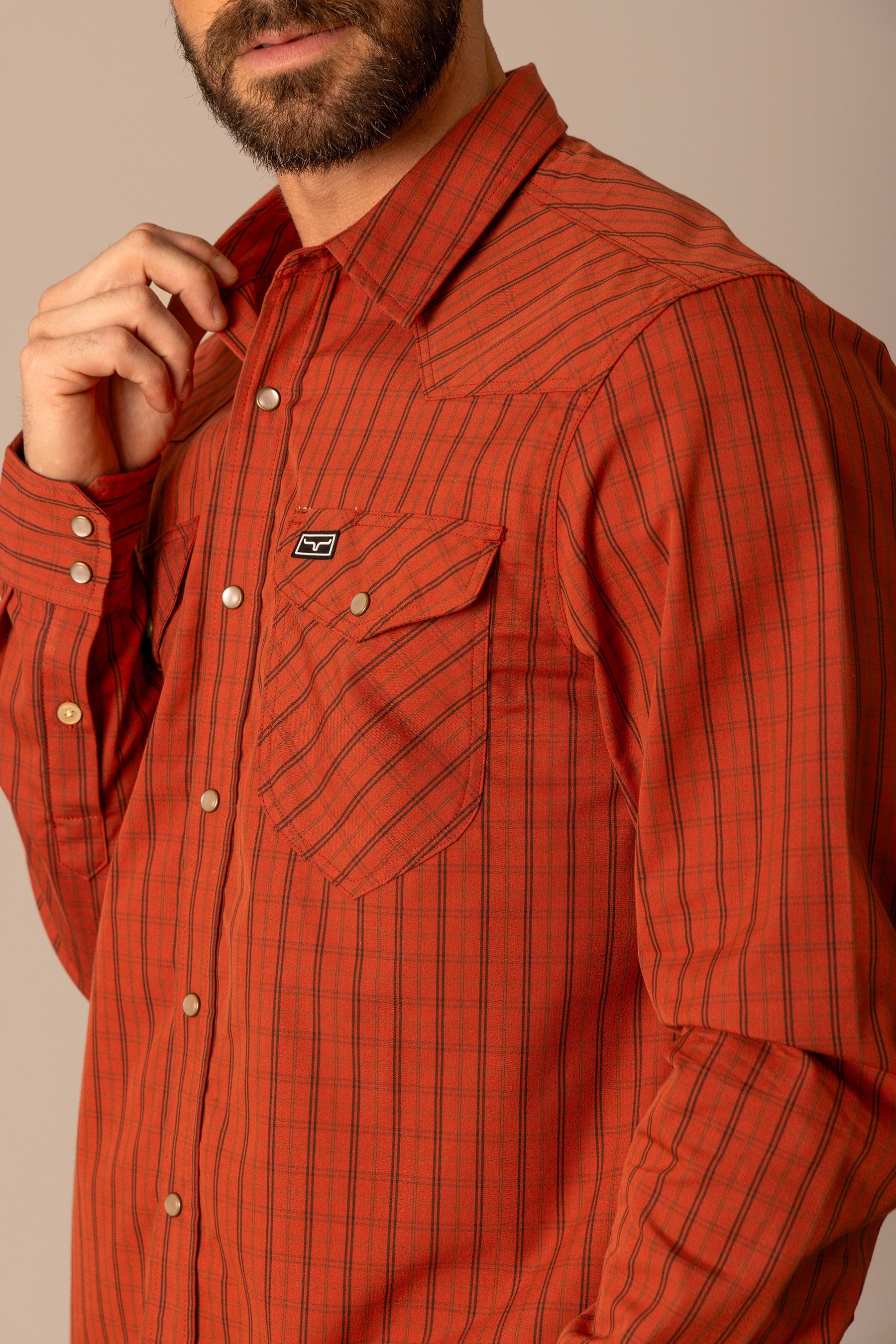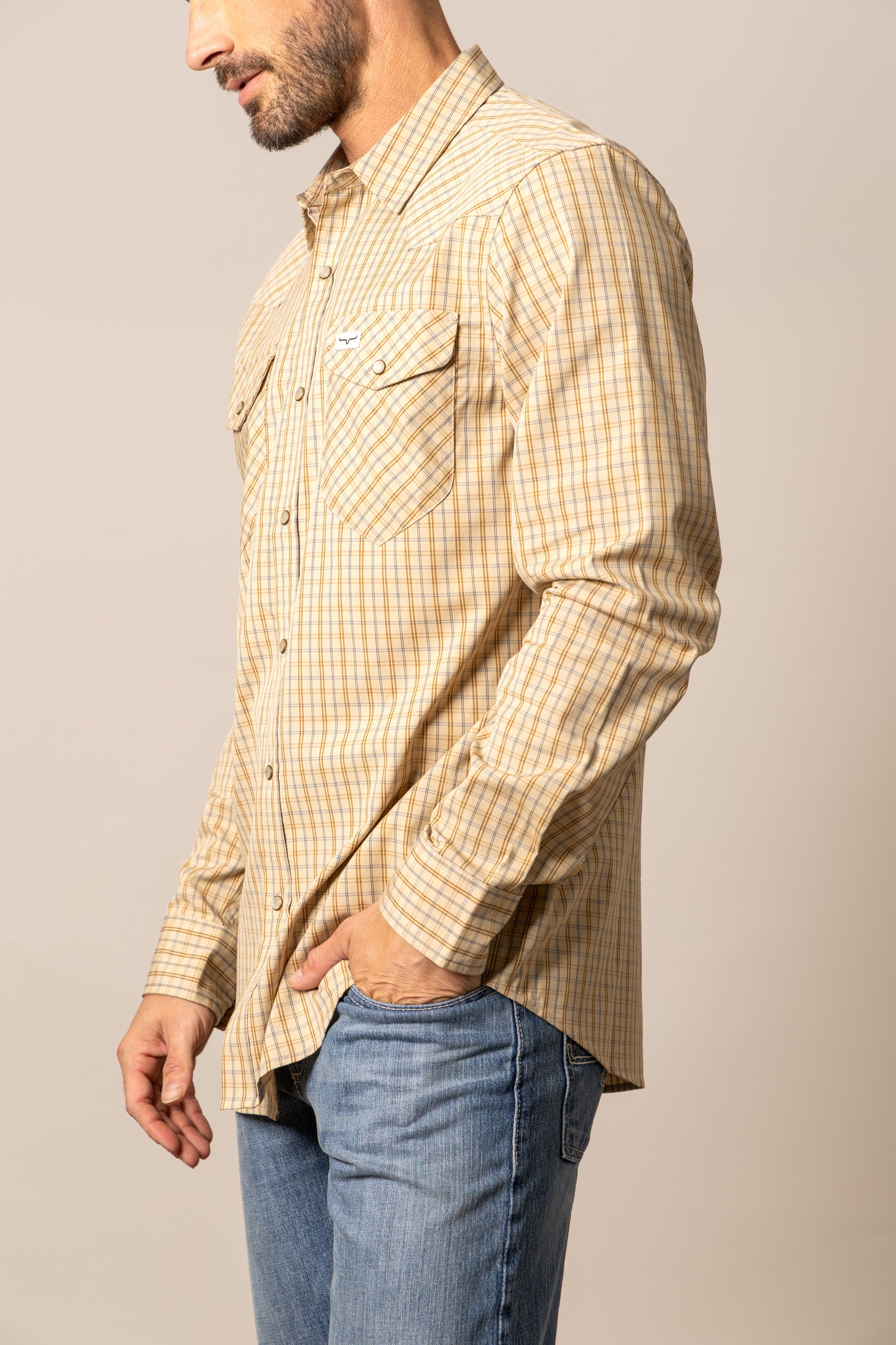 The Smalls Plaid Shirt is a Kimes Ranch classic designed for both comfort and authentic western style. Crafted from a breathable Coolmax blend. this shirt offers moisture control and flexibility while maintaining a polished look. The mini-check plaid pattern delivers timeless appeal. complemented by a western yoke and functional snap-button pockets. Long enough to stay tucked for a sharp finish yet smooth enough to wear untucked. the Smalls transitions effortlessly from workday to weekend.