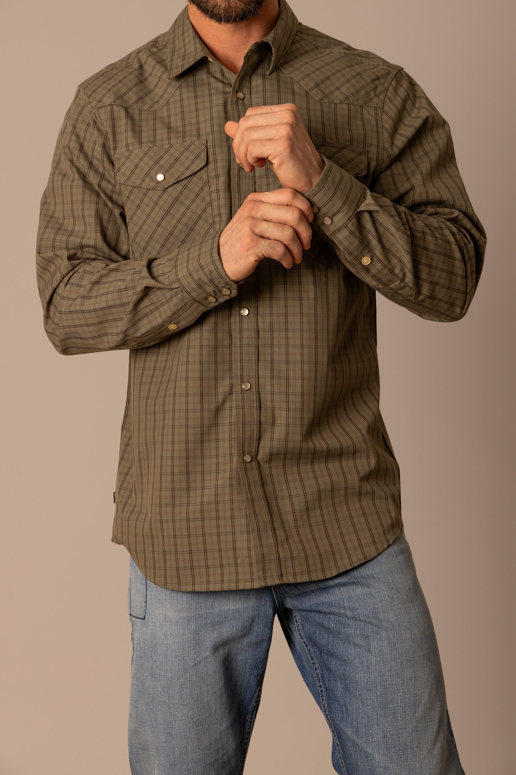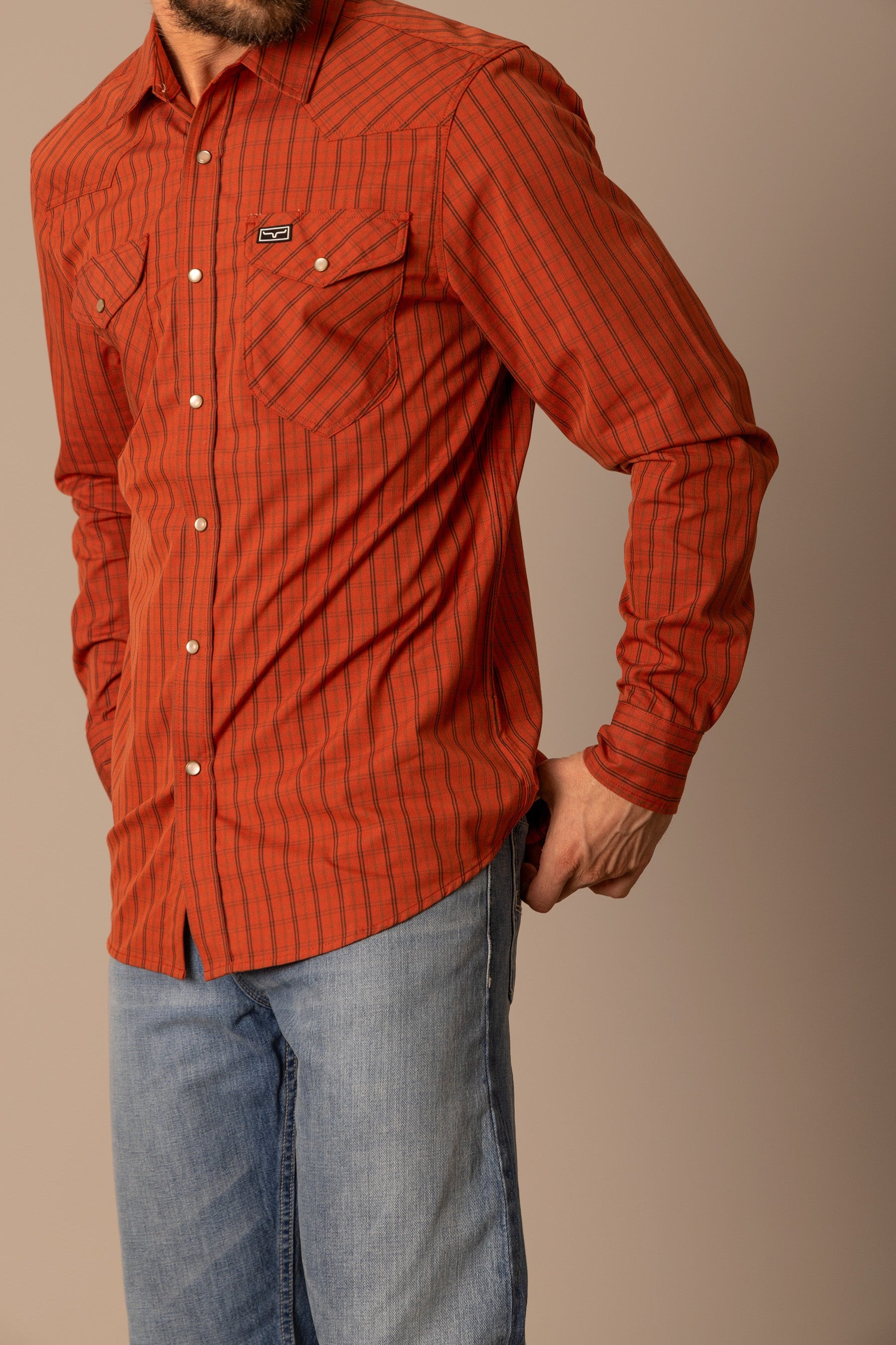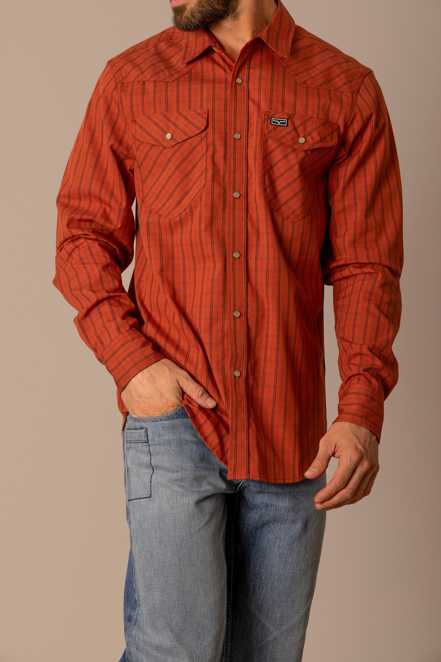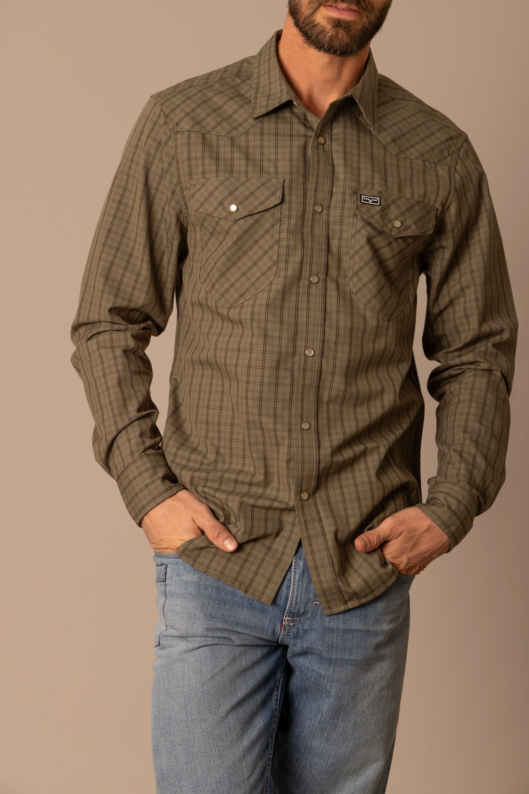 The Smalls Plaid Shirt is a Kimes Ranch classic designed for both comfort and authentic western style. Crafted from a breathable Coolmax blend. this shirt offers moisture control and flexibility while maintaining a polished look. The mini-check plaid pattern delivers timeless appeal. complemented by a western yoke and functional snap-button pockets. Long enough to stay tucked for a sharp finish yet smooth enough to wear untucked. the Smalls transitions effortlessly from workday to weekend.