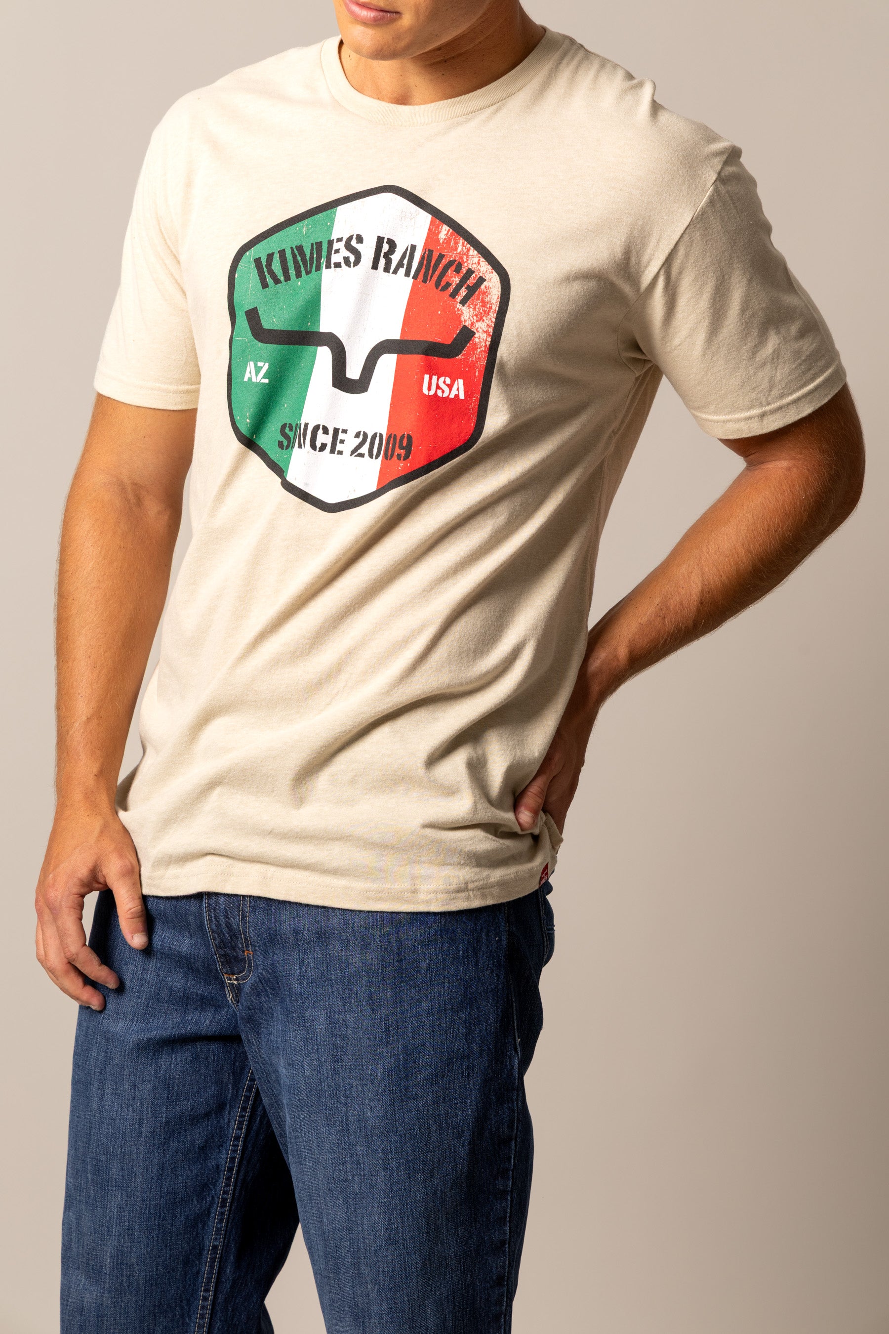 The Triple Stripe Tee celebrates Western heritage and Mexican pride in true Kimes Ranch style. Featuring the iconic horn logo set against the bold green. white. and red stripes of the Mexican flag. this tee makes a statement of unity and strength. Crafted from a soft cotton-poly blend. it delivers all-day comfort and durability — perfect for days on the ranch. at the arena. or out in town.
