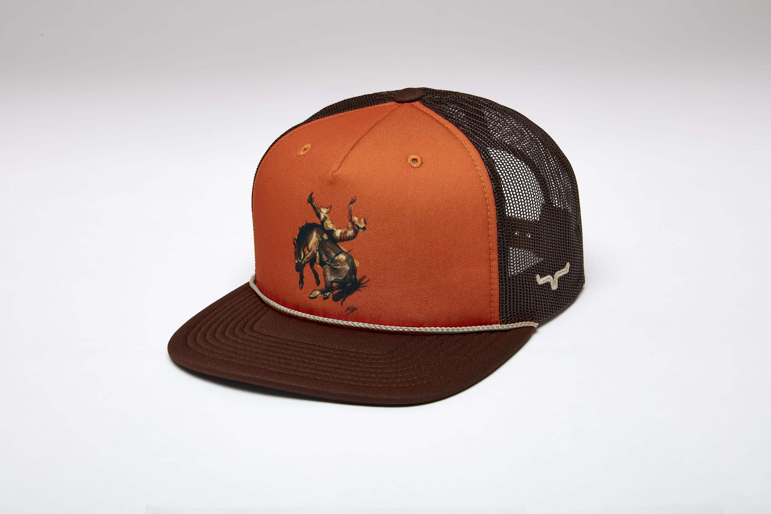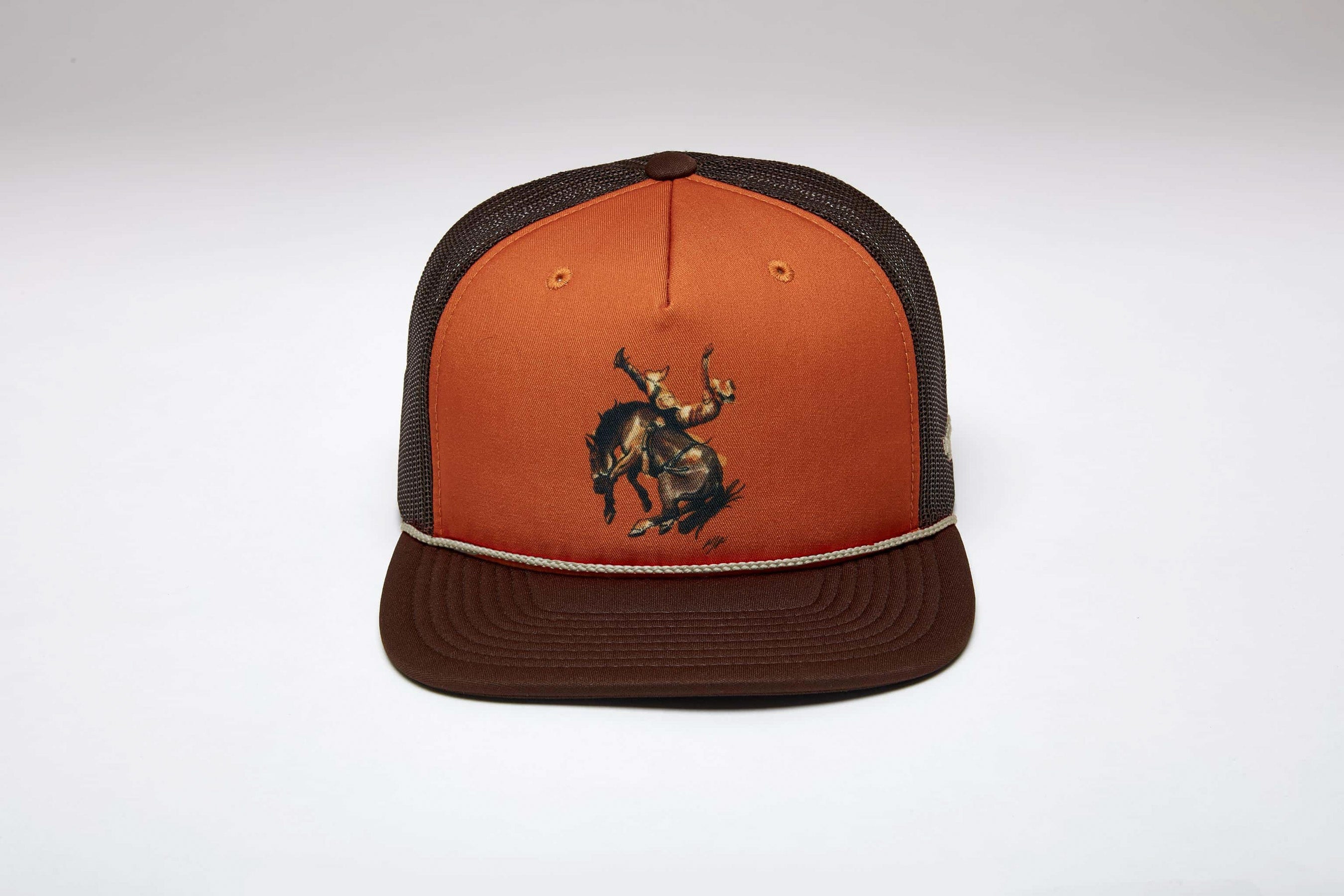 High-profile with a flat bill and adjustable snapback. this 5-panel poly knit hat combines classic structure with standout western artistry. The foam front features sublimated artwork of a bucking horse by renowned western artist Randy Paul. making this a bold. collectible piece for fans of western heritage and modern style alike.